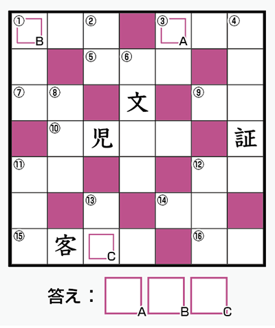 マス目に入るのはすべて漢字です。A~Cを順に並べてできる言葉はなんでしょう?