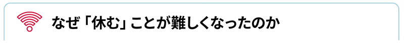 スマートフォン時代の特徴は、仕事とプライベートの境界線が曖昧になったことです。通勤電車の中でメールやスマホをチェックし、帰宅後もチャットツールの通知が鳴り、休日でも「少しだけ」仕事の確認をする―。こうした行動が日常化すると、脳はつねに「仕事モード」から抜け出せなくなります。