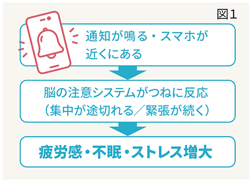 精神医学の観点から見ると、休息とは単に身体を休めることではありません。脳の前頭前野を中心とした「実行機能」を回復させ、ストレス反応を司る自律神経系をリセットすることが重要なのです。しかし、スマートフォンの画面を見続けることで、脳はつねに軽い緊張状態に置かれ、本来の休息が得られません(図1)。