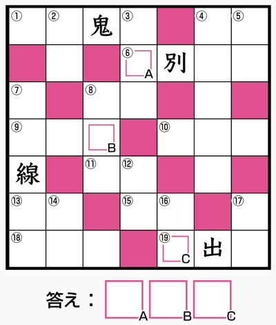 マス目に入るのはすべて漢字です。A~Cを順に並べてできる言葉はなんでしょう?