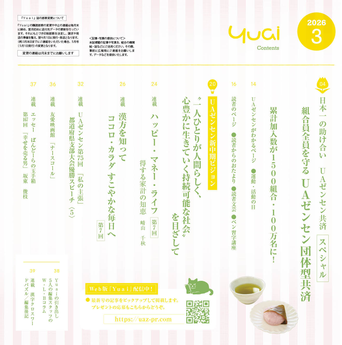 Yuai2026年3月号を発行しましたYuai2026年3月号のお知らせ 2026年3月2日 組合員とご家族を守るUAゼンセンの共済制度。今月号では、加入数が1500組合・100万名に達した団体型共済にスポットを当てます。なかでも加入が急増している「団体型介護共済」のメリットと、最新加入組合事例を紹介します。
