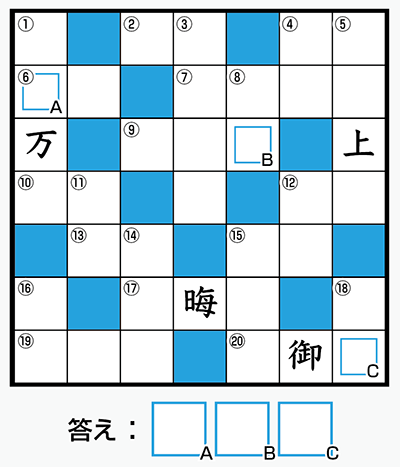 マス目に入るのはすべて漢字です。A~Cを順に並べてできる言葉はなんでしょう?
