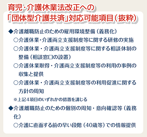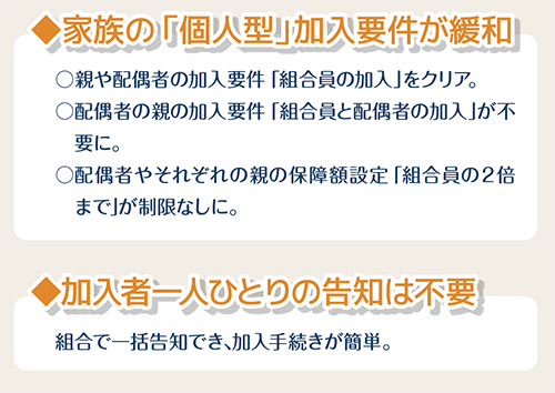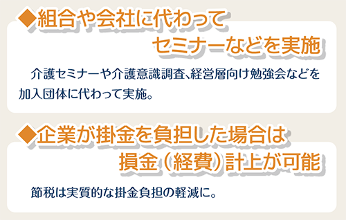介護共済は団体型と個人型があり、団体型で制度全体を下支えする一体運営となっています。組合や共済会、企業などで組合員(従業員)を一括加入することで、全員が介護共済のメリットを受けることができます。団体型に加入していれば、配偶者や親の加入要件が緩和され、個人型の掛金負担の軽減にもつながり、個人型加入への後押しにもなります。また、昨年の育児・介護休業法改正で生じた企業義務に対応できるなど、企業にも多くのメリットがあります。介護における仲間の不安や離職を防ぐために、労使で加入をご検討ください。