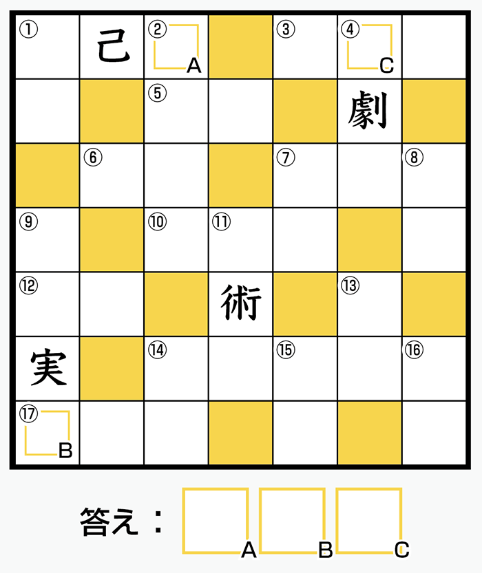 マス目に入るのはすべて漢字です。A~Cを順に並べてできる言葉はなんでしょう?