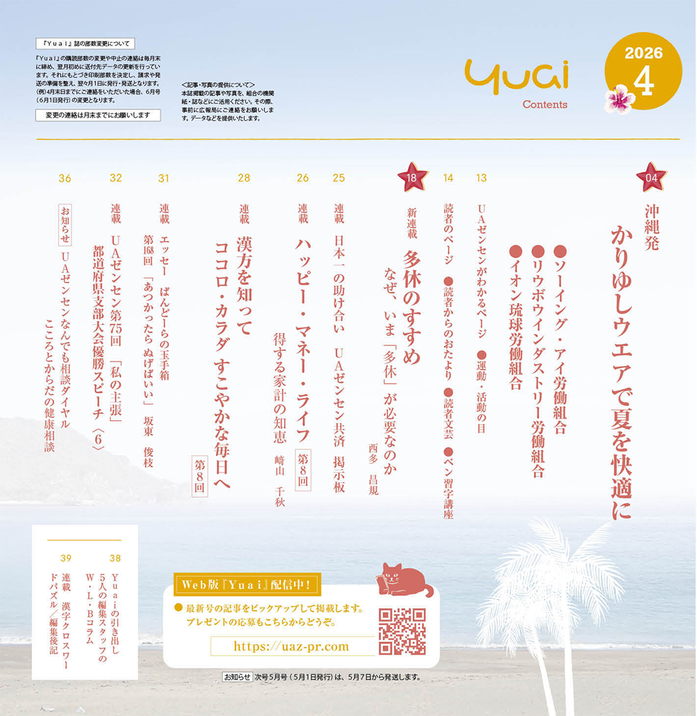 Yuai2026年4月号を発行しましたYuai2026年4月号のお知らせ 2026年3月31日 今月は早くも夏の猛暑に備えて、沖縄の加盟組合の仲間がお届けする「かりゆしウエア」を大特集。最新作を6名の方にプレゼントします。ぜひご応募ください。また、新連載「多休のすすめ」を初回拡大版でお送りします。